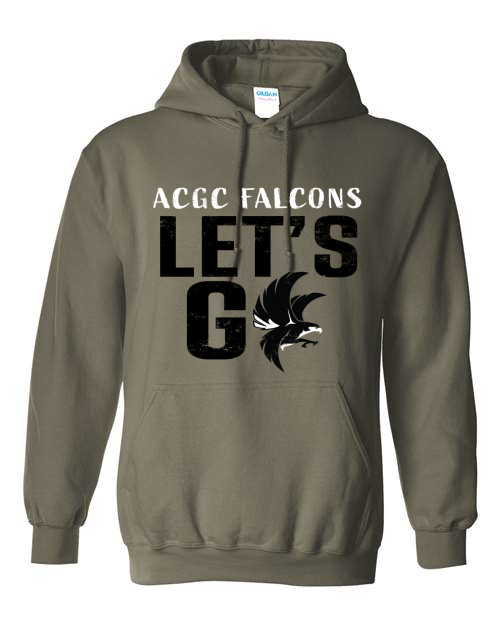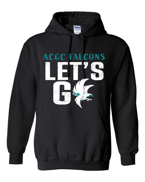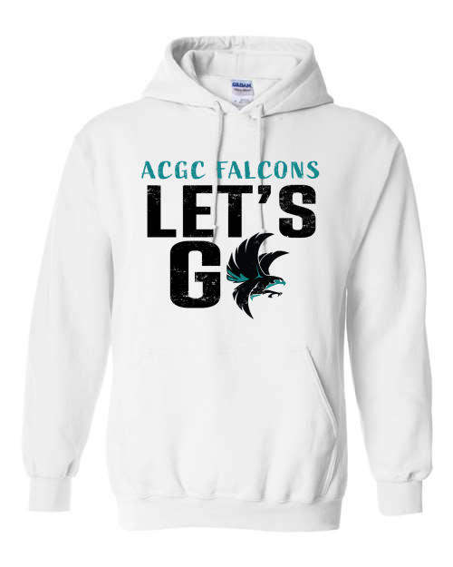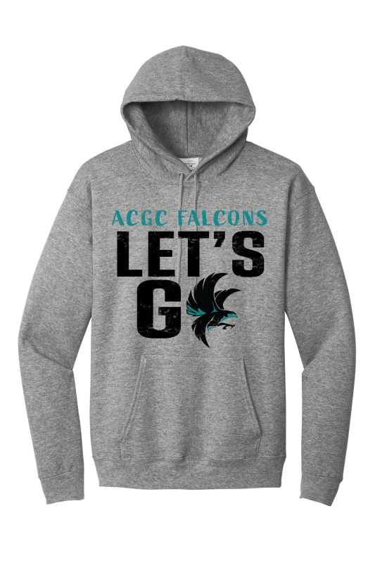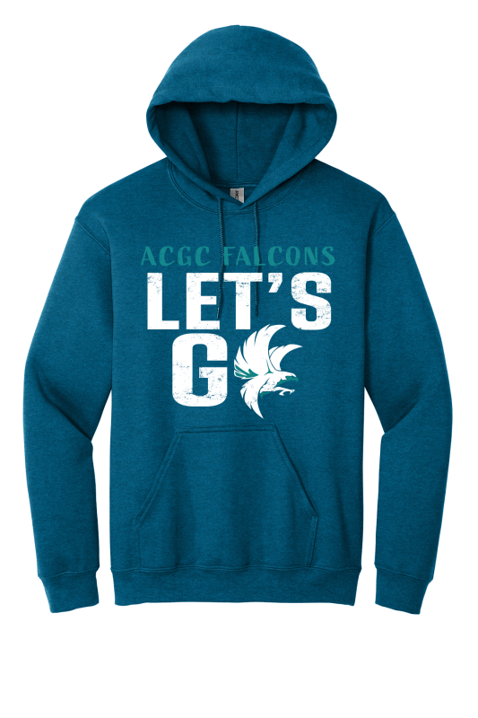 8-ounce 50/50 cotton/poly hooded sweatshirt, Moisture-wicking properties Tearaway label, Two-ply hood with grommets and dyed-to-match drawcord, Rib knit cuffs and waistband, Front pouch pocket. ACGC LET'S GO logo on full front.
