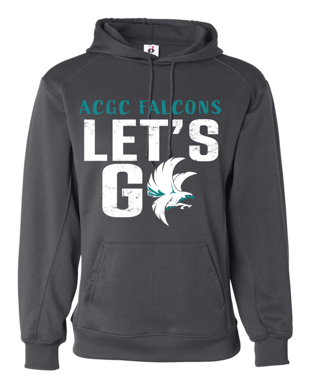 Badger Polyester Hooded Sweatshirt . 7 oz. 100% spun polyester fleece; Front pouch pocket with hook and loop closures for headset opening, Side and underarm textured waffle weave panels. ACGC LET'S GO logo on full front.