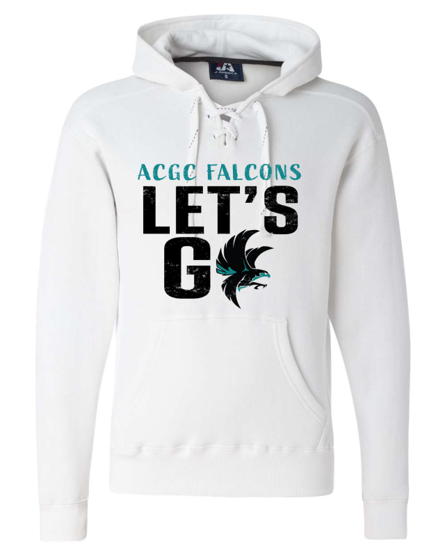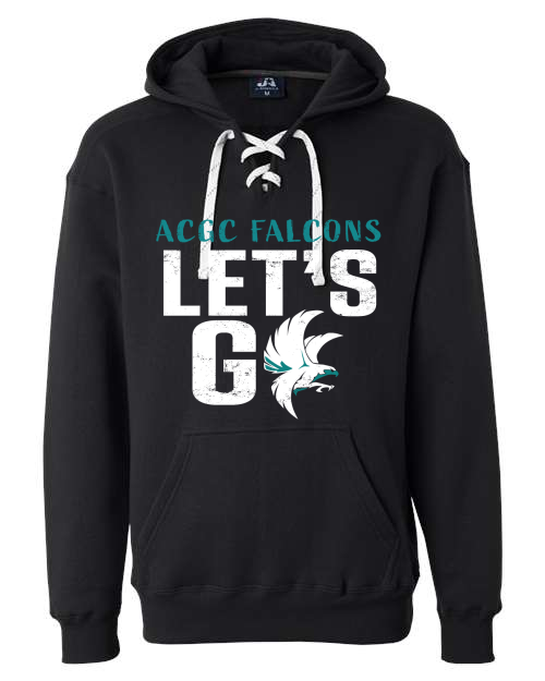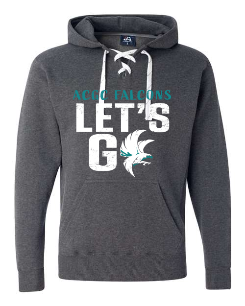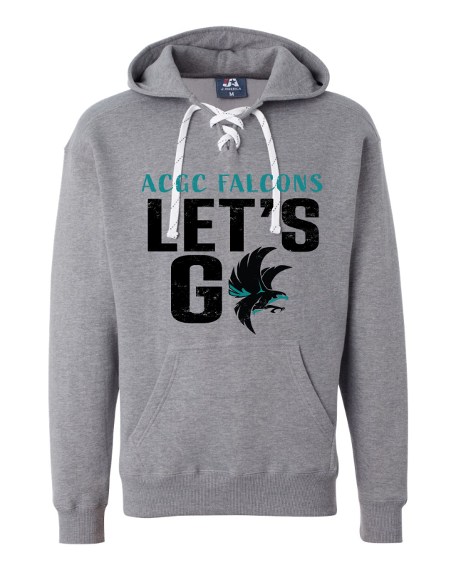 J. America 10 oz., 80/20 cotton/poly lace hooded sweatshirt. Jersey-lined three-piece hood; split front placket with six sewn eyelets; thick flat white drawcord with grey ticking; sport shoulder panel; front pouch pocket; spandex blend ribbed cuffs, waistband and side gusset panels. ACGC LET'S GO logo on full front. Optional colored laces sold separately.