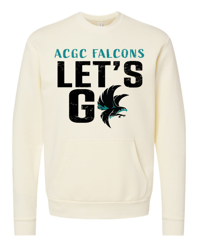 7.4 oz. 80/20 cotton/poly crew pocket fleece, 1x1 ribbed neck, cuffs and waistband; Contrast 3/8" Back Neck Binding; Side Seam; Tear away label; Regular fit; Slip into this cozy pullover with softness like no other; Convenient large front pocket for storage and warmth; Includes locker patch for more branding options; Part of the Beach Fleece collection, keep it casual cool with laid-back apparel. ACGC LET'S GO logo on full front.