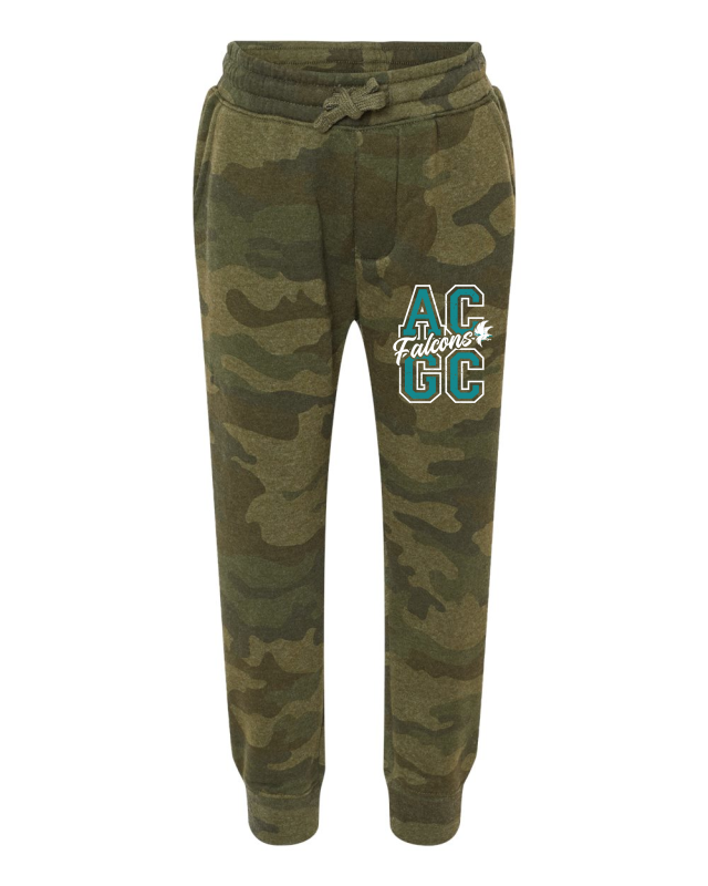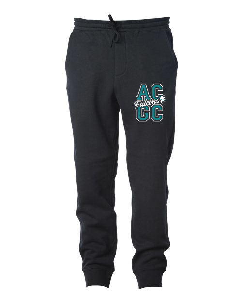 Independent Trading Co. 6.5 oz./yd², 52/48 cotton/polyester blend, 32 singles, Relaxed fit, Elastic waistband, Flat drawcord, Sewn eyelets, Sewn fly detail, Back pocket, Jersey lined hand pockets, 1x1 ribbing at cuffs, Tear away label. ACGC Falcons logo on left leg.