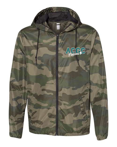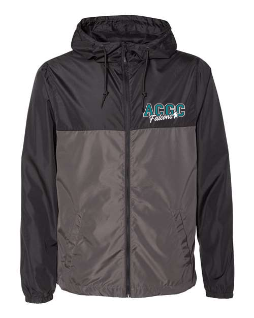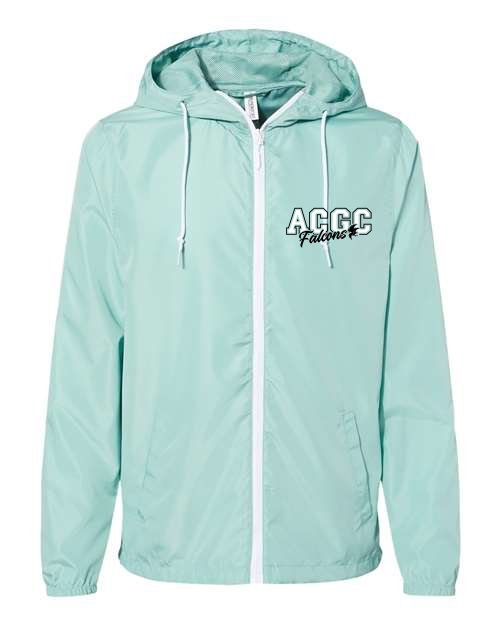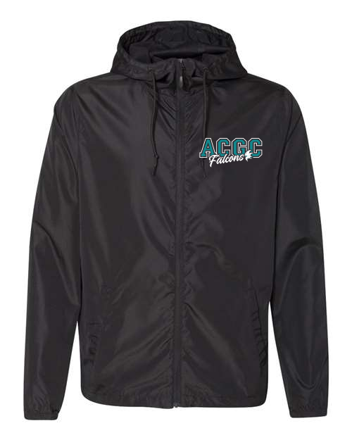 2.5 oz./yd² (US) 4.5 oz./L yd (CA), 100% polyester fabric windbreaker with interior water-resistant coating; Waterproof pressure resistance: 600 mm; No lining; Matte finish eyelets and zippers; #4 zipper with zipper pull & rubber zipper pull tab; Reversed zipper tapeSingle layer body with fine mesh hood liner; Three panel hood; Scuba neck; Self-neck tape; Welt pockets with mesh pocket bags; Tightening toggle at waistband; Elastic cuffs; Locker loop in center back. ACGC Falcons logo on left chest.