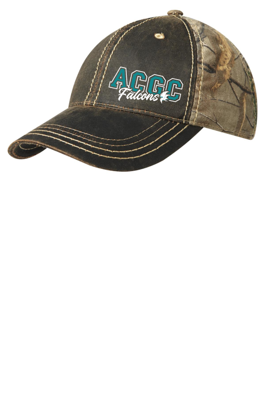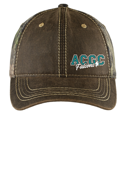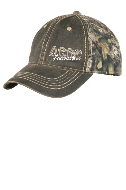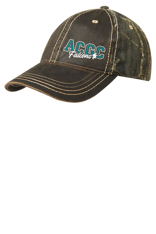 A pigment print on the front panels visor and closure gives this cap an oiled leather look. A popular camo pattern completes the mid and back panels. Fabric: 52/48 cotton/poly front panels 60/40 cotton/poly canvas mid and back panels Structure: Unstructured Profile: Low Closure: Hook and loop. ACGC Falcons logo on left side.